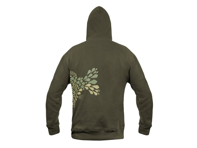 Je vyrobena z materiálu tmavě zelené barvy, čímž dokonale zapadne do přírodního prostředí. Motiv kapra vyobrazený na mikině je kompletně tvořen z jednotlivých prvků kaprařských montáží jako jsou obratlíky, olůvka, návazec a podobně. Tím se stává Delphin TACKLE rozpoznatelným a opravdu jedinečným kouskem mezi kaprařským oblečením. V přední části disponuje dvěma kapsami, které umožňují ohřátí rukou v chladném počasí, ale také uschování a přenos různých věcí.