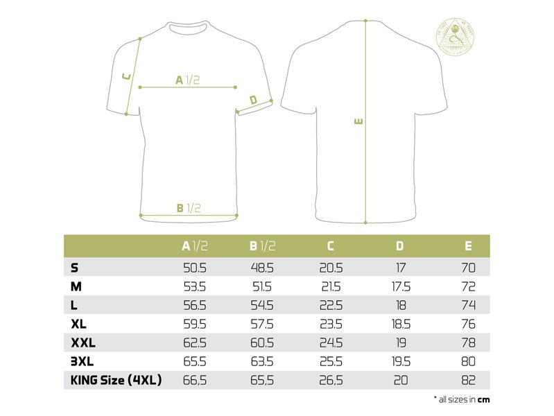Samotné tričko je vysoké kvality, stejně jako použitý barevný tisk. Nabízíme je v široké škále velikostí od S až po KING SIZE (ekvivalent 4+XL, který je ve většině zemí označován jako XXXXXL). Model King size tedy hravě oblékne i ty nejstatnější rybáře o hmotnosti 135kg+.